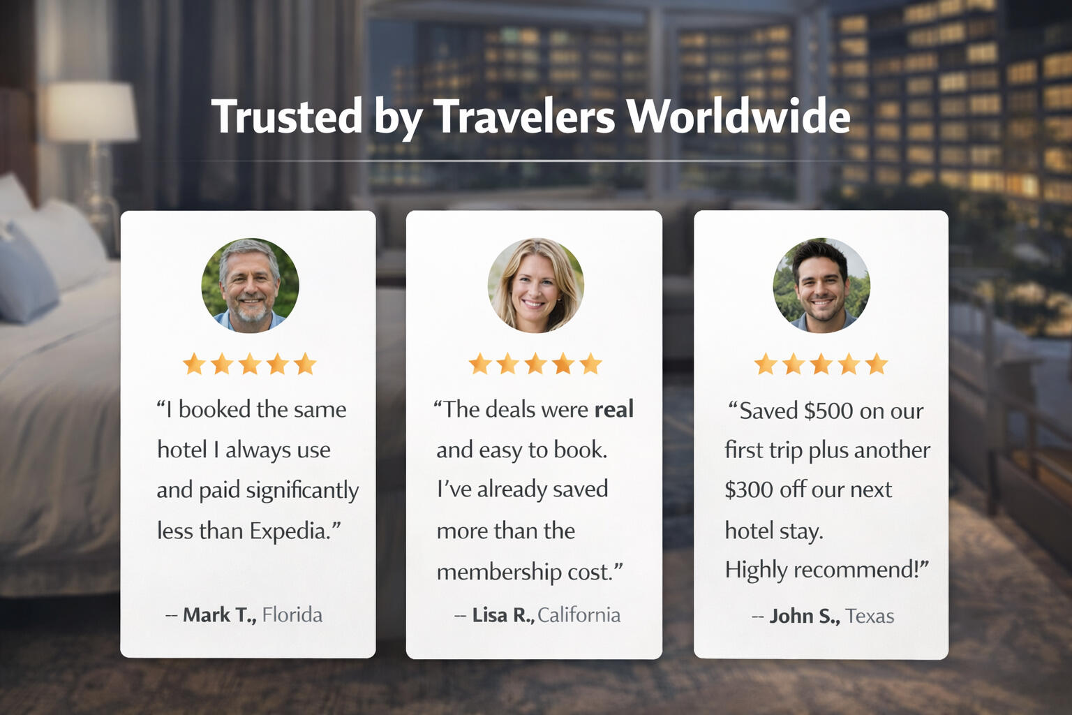 Bonus: Receive a Complimentary Trip When You JoinWhen you sign up as a member, you receive access to a complimentary trip offer that can be used toward a hotel stay, resort, or vacation package.This free trip is included as a member bonus, giving you the opportunity to experience the platform right away—while also unlocking ongoing access to exclusive travel savings.Many members use this free trip for their first getaway, then continue saving on future trips with member-only pricing.Taxes, fees, availability, and destination options may apply. Full details are explained during the member overview.
