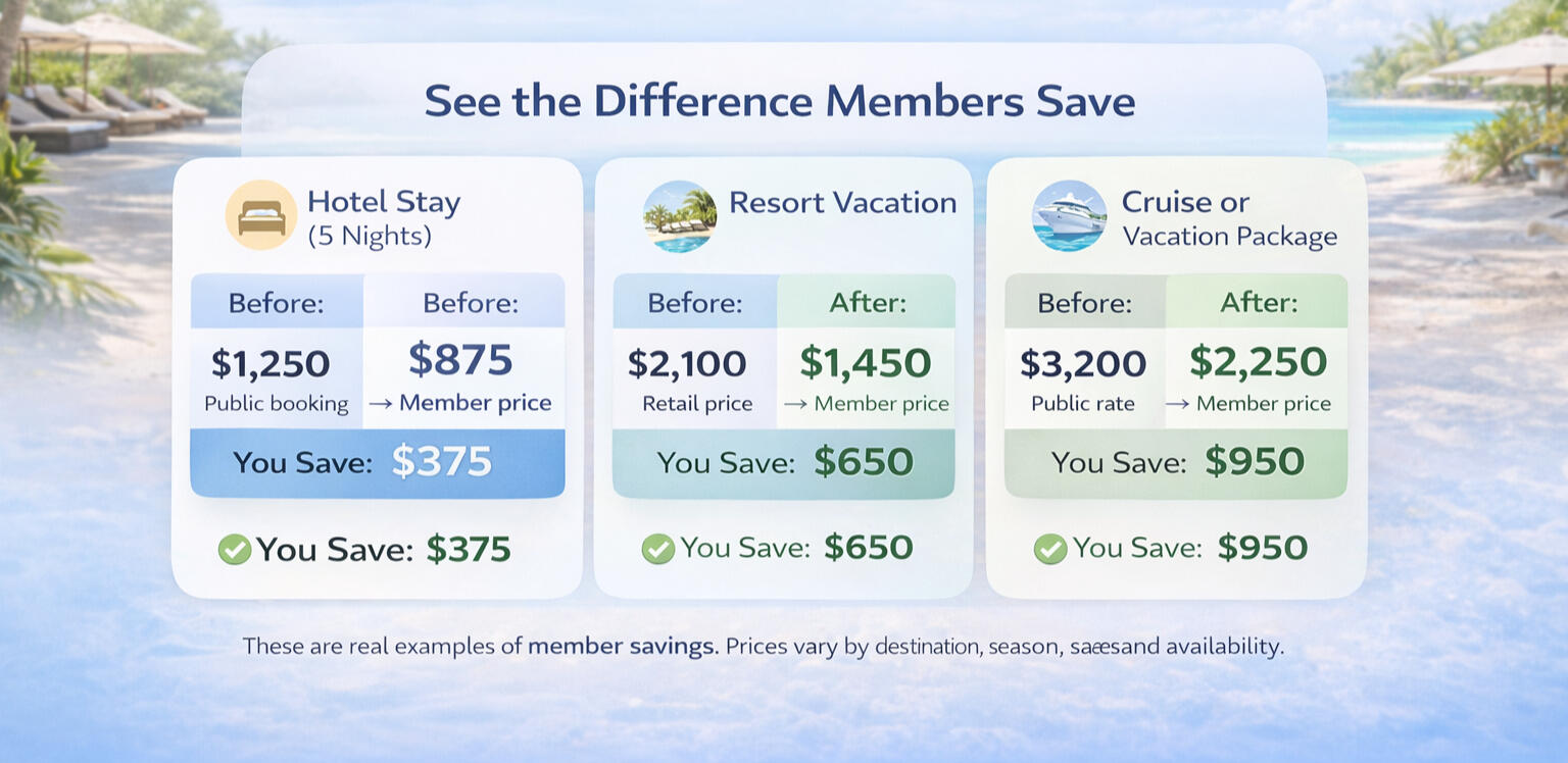 Most travelers pay full price because they only see what public booking sites show.Members get access to private travel rates on the same hotels, resorts, and vacations—so they book the trips they already want, just for less.